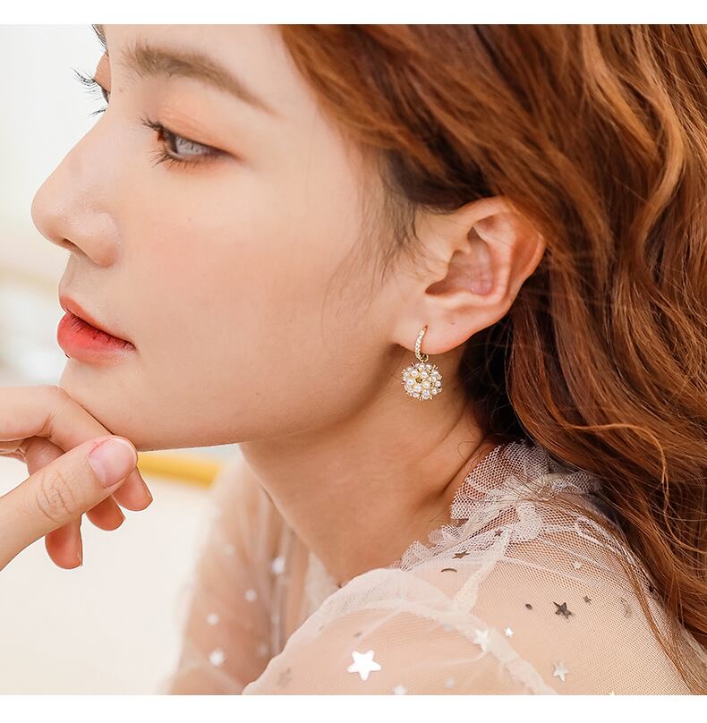 シンプルで耳たぶに咲く花ような人工真珠のリング式ピアス
